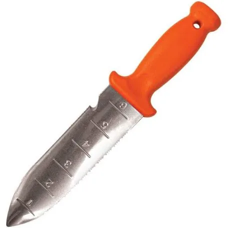 Deluxe Soil knife (Hori Hori) - This tool has a two-edged (1 serrated, 1 smooth) 6” blade with inch depth markings etched into the blade, as well as a twine-cutting notch. Use it for laying seed, planting, slicing, weeding, digging rocks, cleaning cracks, cutting soil bags open. I like the A.M. Leonard or the Truly Garden brand (given to me by my husband). This tool goes with me to every garden.